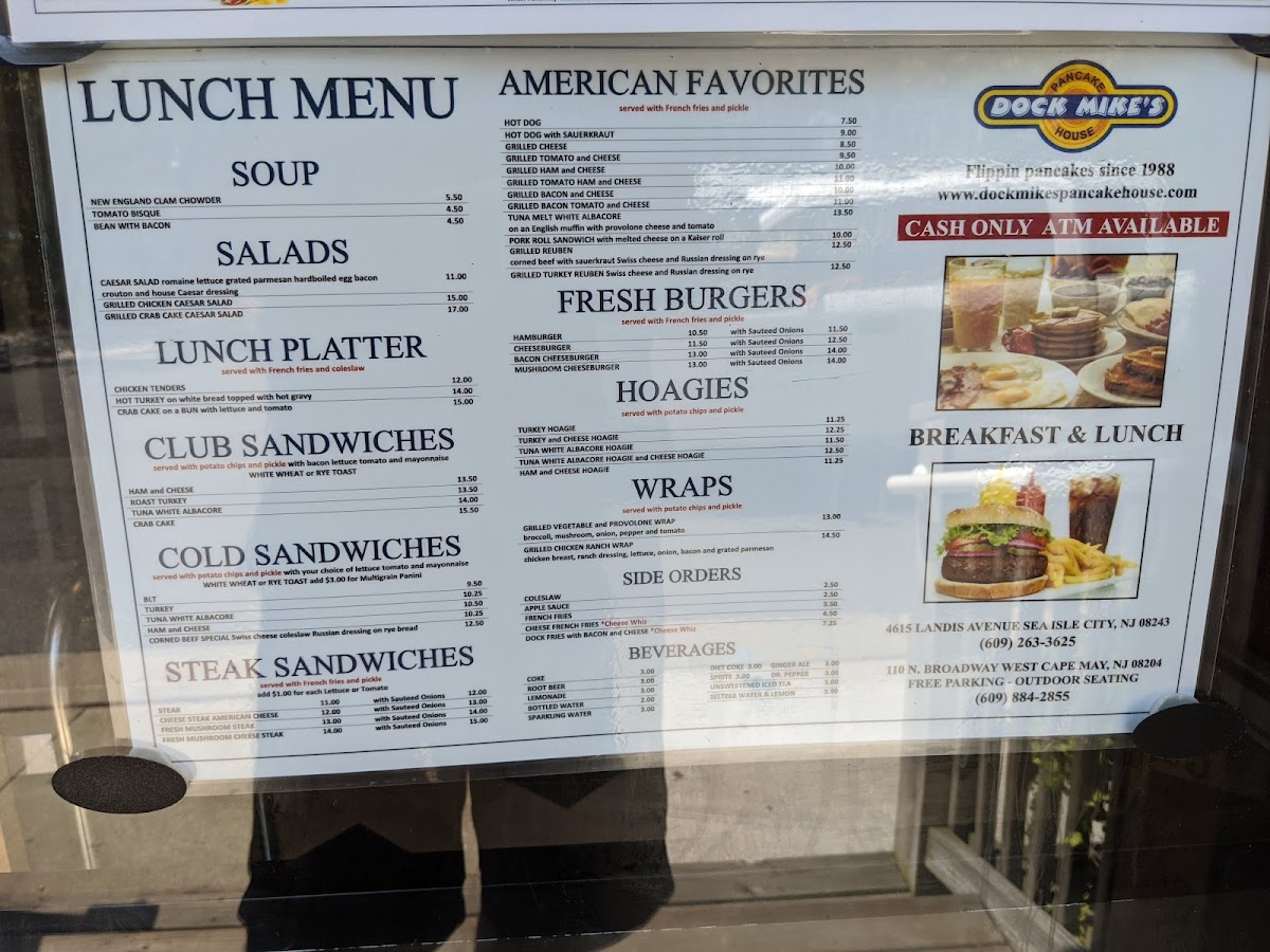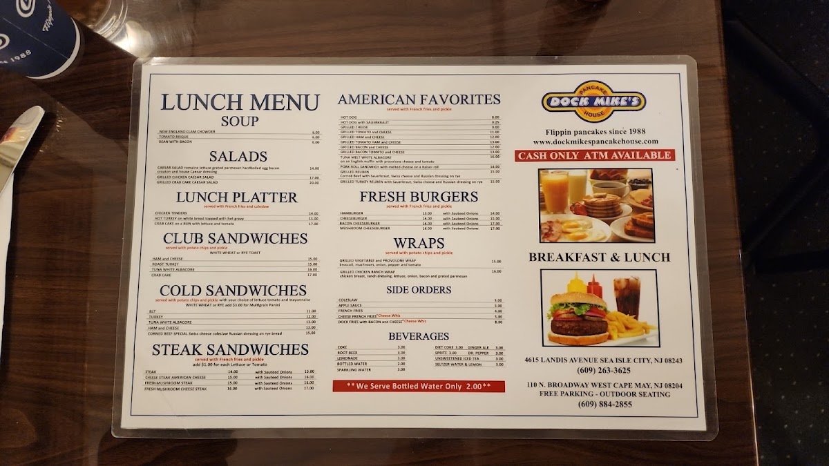 As a reviewer, I find the menu at Dock Mike's Pancake House Inc to be an impressive and well-rounded reflection of a classic American diner with a strong breakfast identity and an all-day comfort-food appeal. The menu balances lighter options like Caesar Salad, Grilled Chicken Caesar Salad, and Grilled Crab Cake Caesar Salad with hearty lunch plates such as Chicken Tenders, Hot Turkey, and Crab Cake. Sandwich lovers are well served with Ham And Cheese, Roast Turkey, Tuna White Albacore, and Crab Cake club sandwiches, as well as satisfying steak options including Steak, Cheese Steak American Cheese, and Fresh Mushroom Cheese Steak.