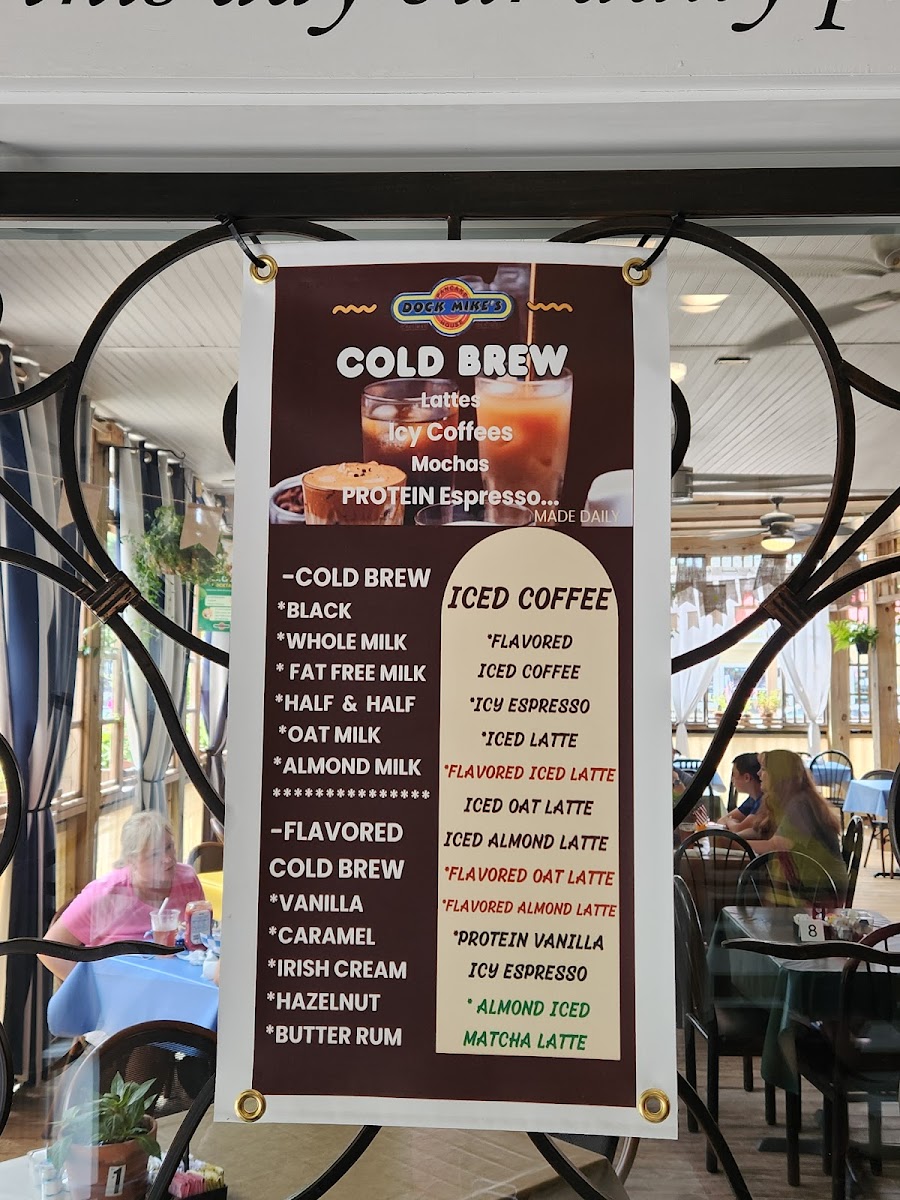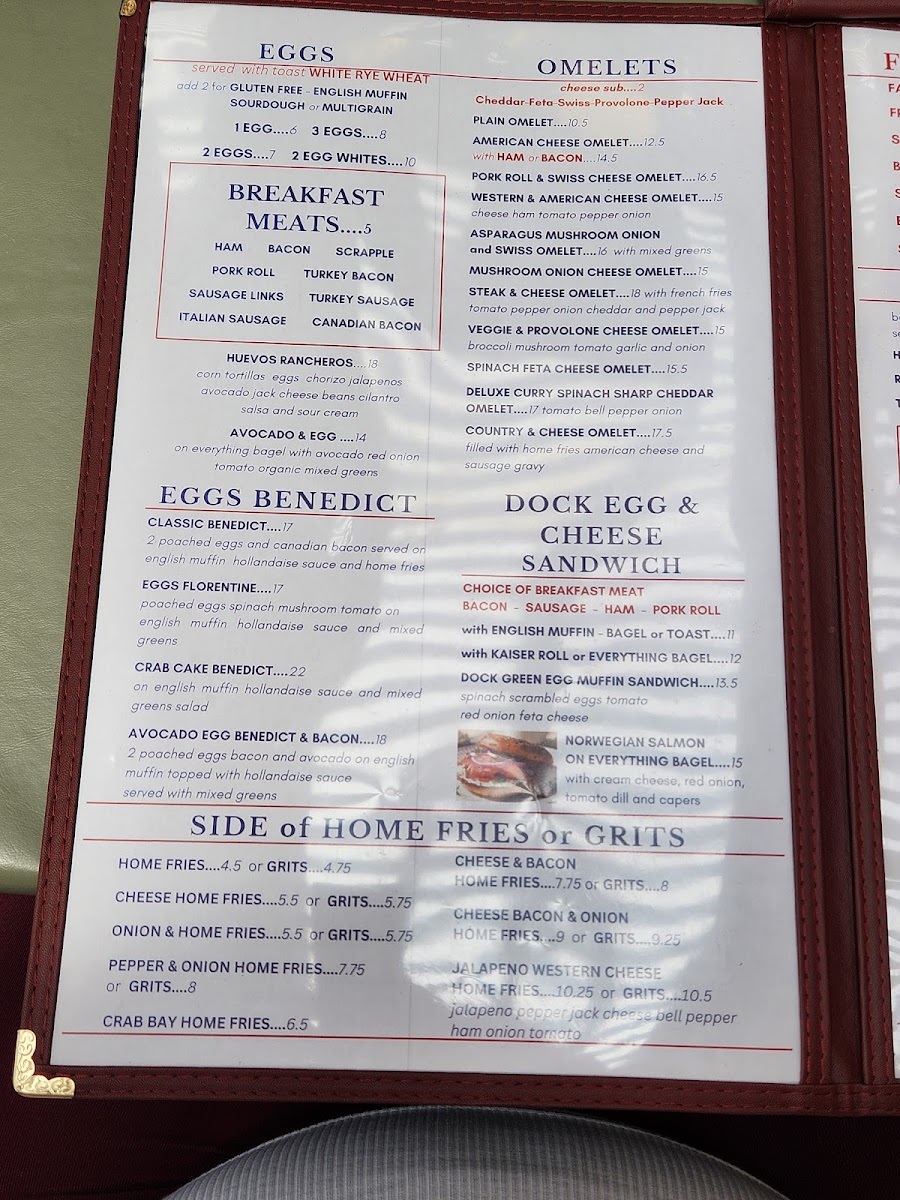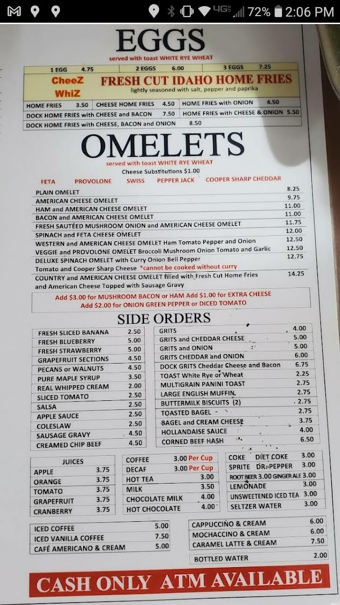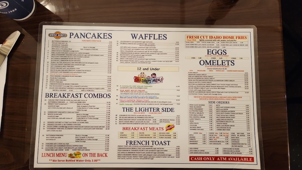 Families will appreciate the thoughtful kids’ selections like Dock Mikey Mouse Pancakes, Puppy Pancakes, and 5 Chocolate Chip Dollar Pancake, while beverage choices-from Iced Coffee, Fresh Brewed Iced Tea, and Fresh Orange Juice to fun docktails like Pina Colada and Shirley Temple-round out the experience. Overall, the menu feels generous, nostalgic, and inclusive, successfully combining variety, comfort, and creativity into a dining experience that caters to all ages and appetites.